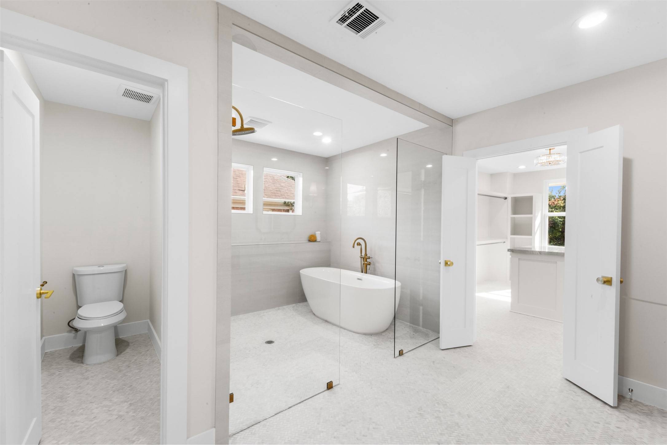 The chef's kitchen showcases custom floor-to-ceiling cabinetry, stainless steel appliances, and leathered quartzite countertops, opening to light-filled living spaces with oversized windows. Each bedroom includes its own private en suite bath, offering comfort and privacy for family and guests.